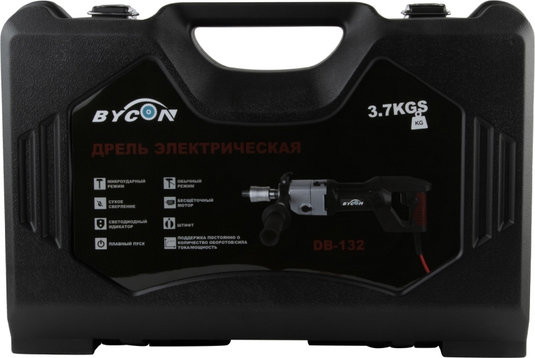 Бесщеточная дрель для сухого алмазного сверления с микроударом Bycon DB-132 (Байкон ДБ-132) – алмазная дрель с микроударом для сухого алмазного бурения отверстий Ø 10 – 102 мм в бетоне, железобетоне, "легком" бетоне, шлакобетоне, кирпиче и других особенно твердых материалах при высокой рабочей скорости; как с использованием станины, так и "с рук"; для профессионального использования. Отличный вариант как для монтажников кондиционеров, так и для электриков. С дополнительными переходниками позволяет работать как алмазными коронками стандартной длины, так и коронками для подрозетников.