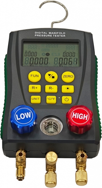 Цифровой манометрический коллектор со шлангами и клеммами в кейсе Voll V-100 Digital (Волл В-100 Диджитал) используется для измерения давления и температуры в системах кондиционирования, тепловых насосов и холодильного оборудования.